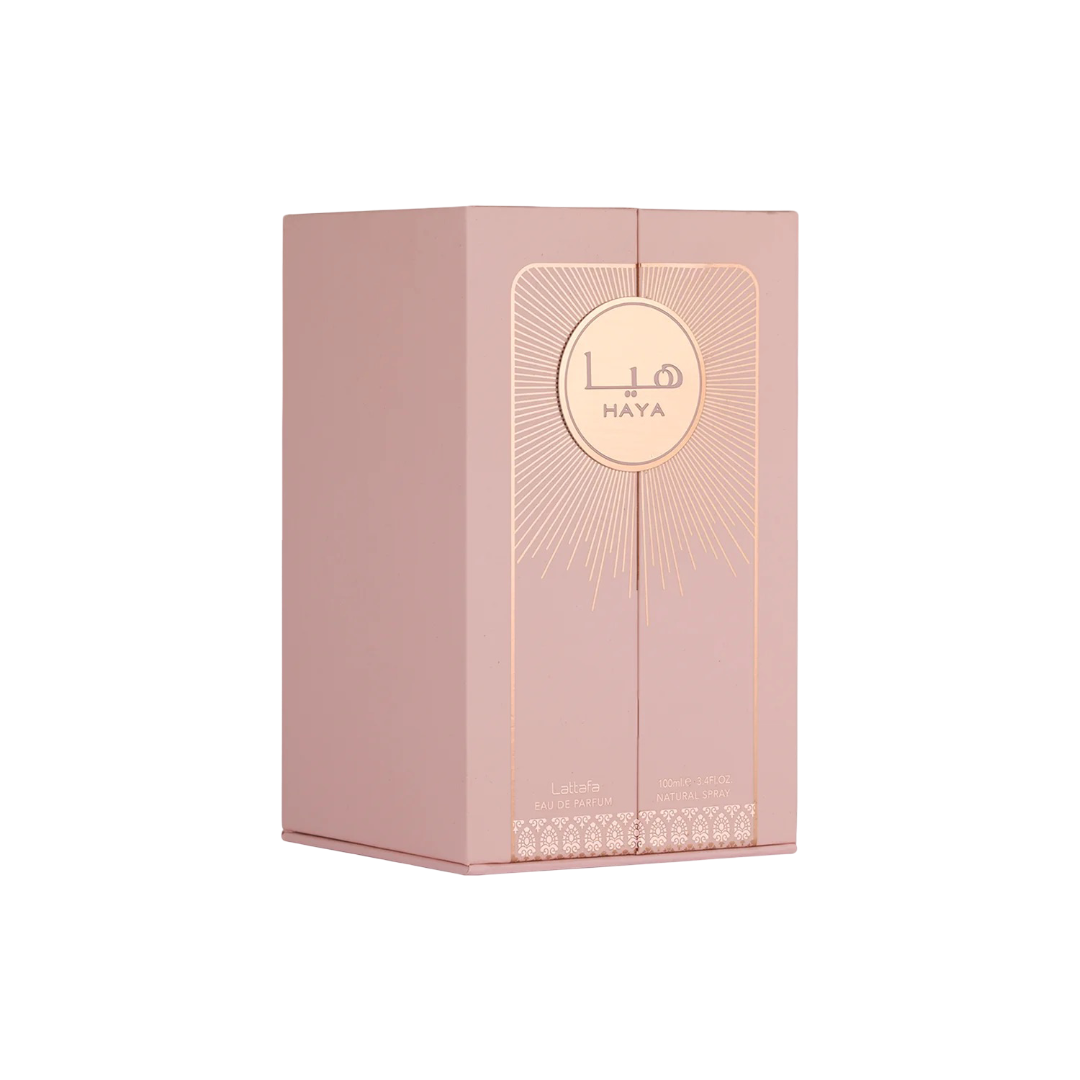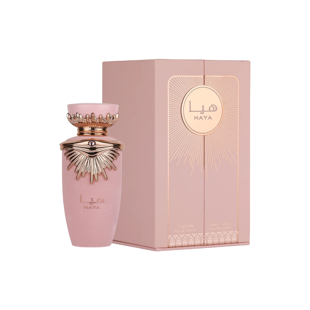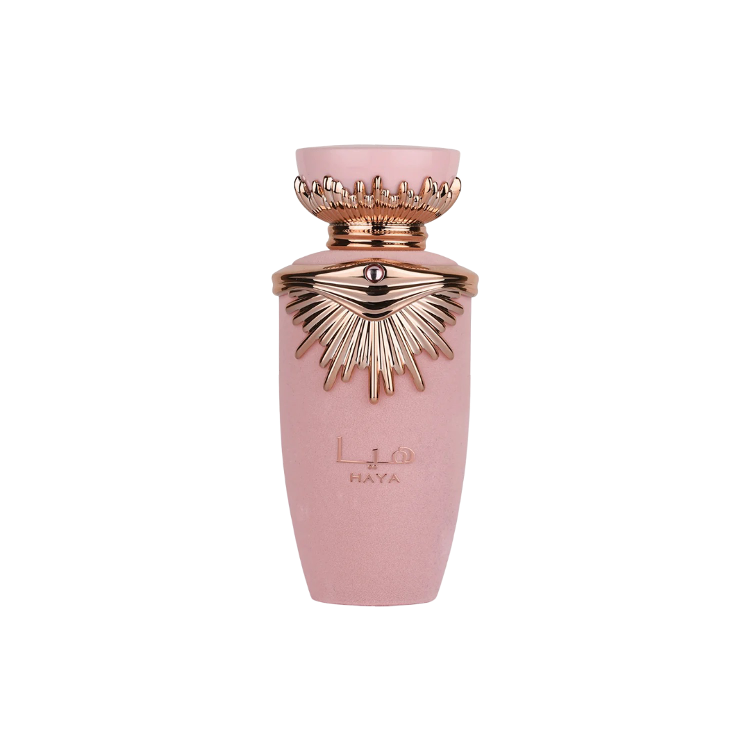 Haya by Lattafa Perfumes is a fragrance for women. This is a new fragrance. Haya was launched in 2022. Top notes are Champagne, Strawberry, Rose, Tangerine and Blood Orange; middle notes are Gardenia, Jasmine and Vanilla Orchid; base notes are Amber, Sandalwood and Chestnut.